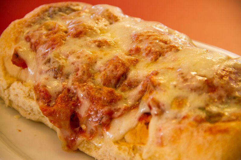 3 Basilio buda meatballs, on a homeade sandwich roll, covered in our homemade pizza sauce, and provolone cheese